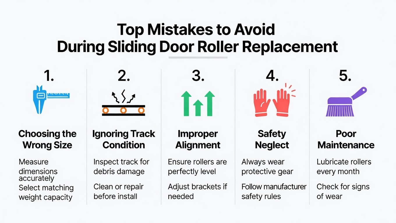 | Ukuran rol salah | Pintunya duduk aneh, tidak bisa dikunci, masih terseret | Ketidakcocokan nilai diameter/offset/beban | Cocokkan spesifikasi roller dengan aslinya; verifikasi diameter roda & kedalaman housing |